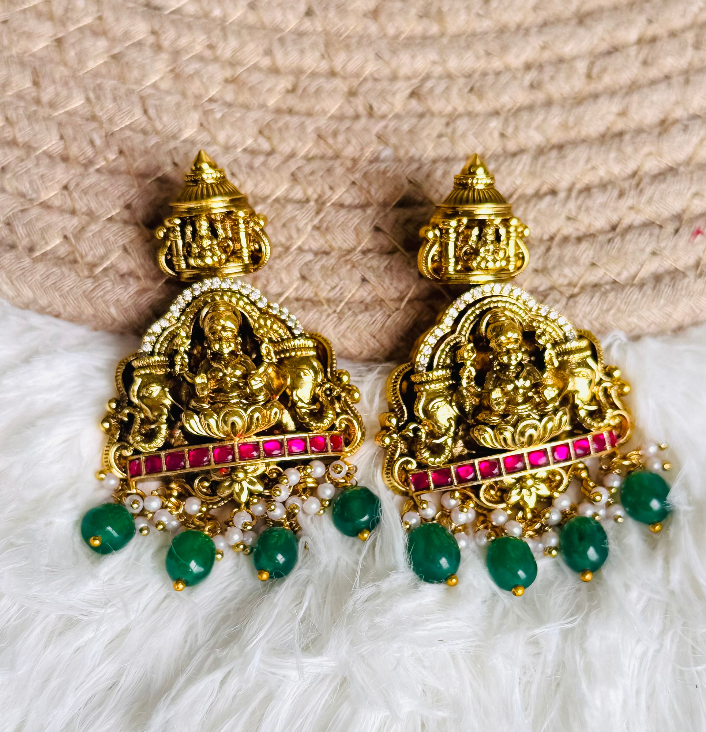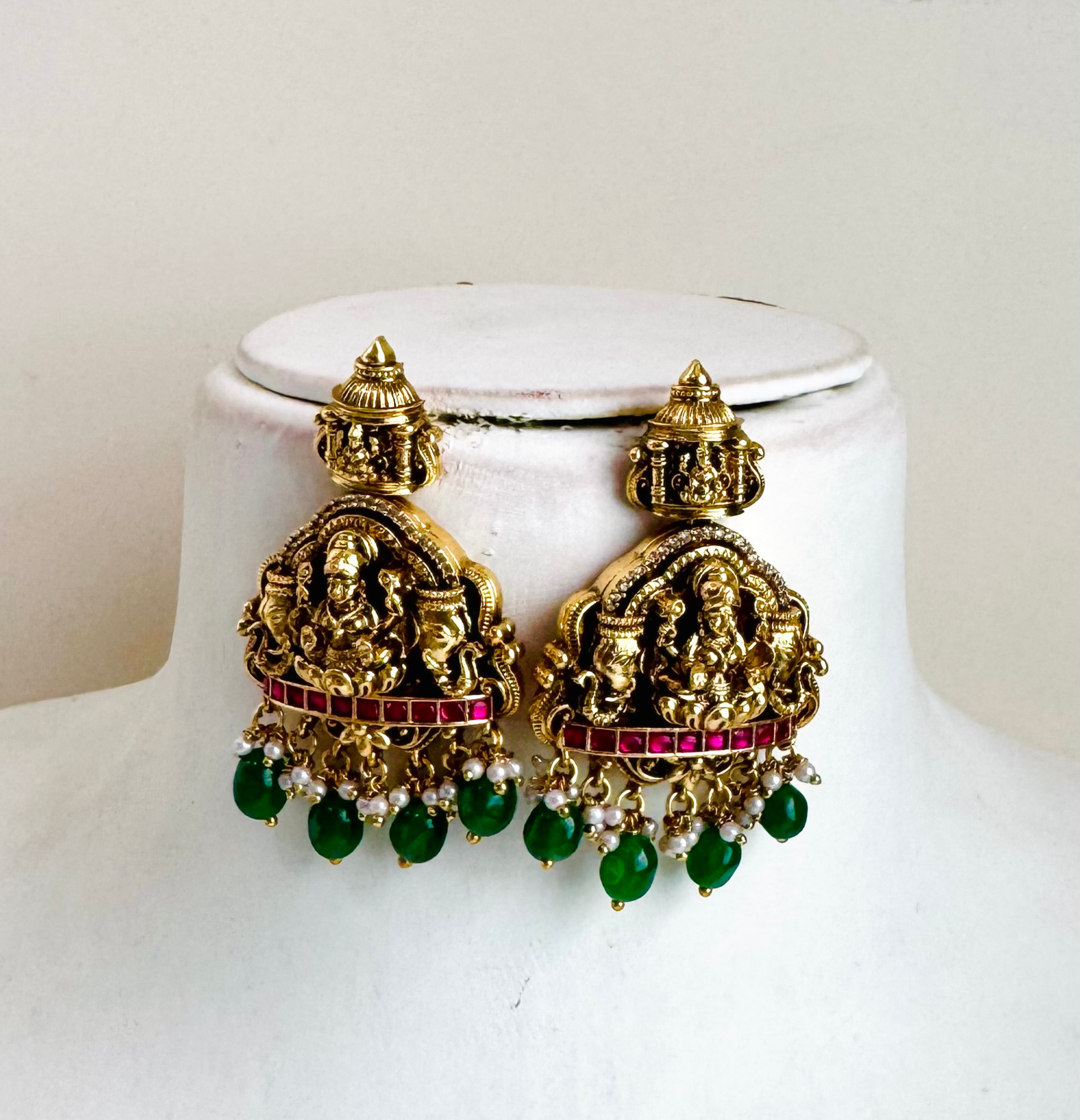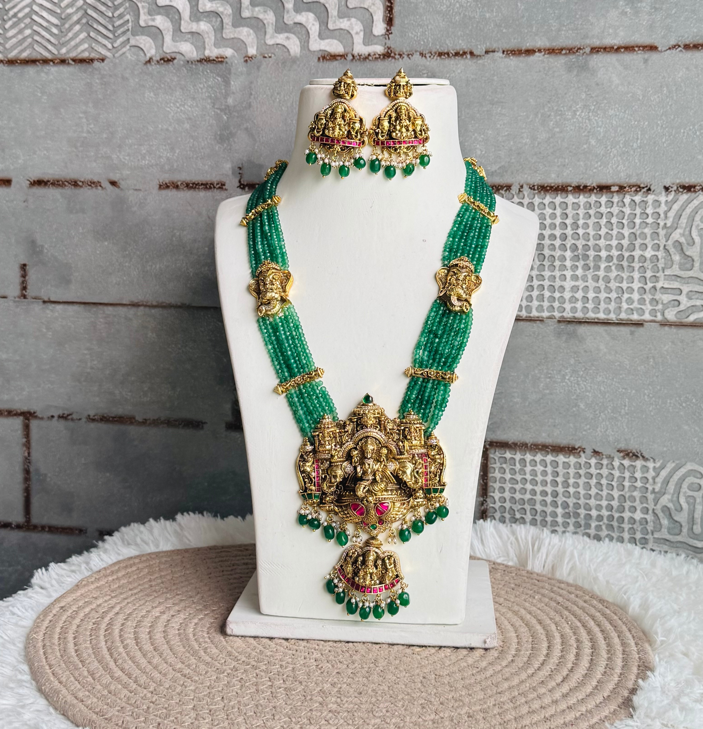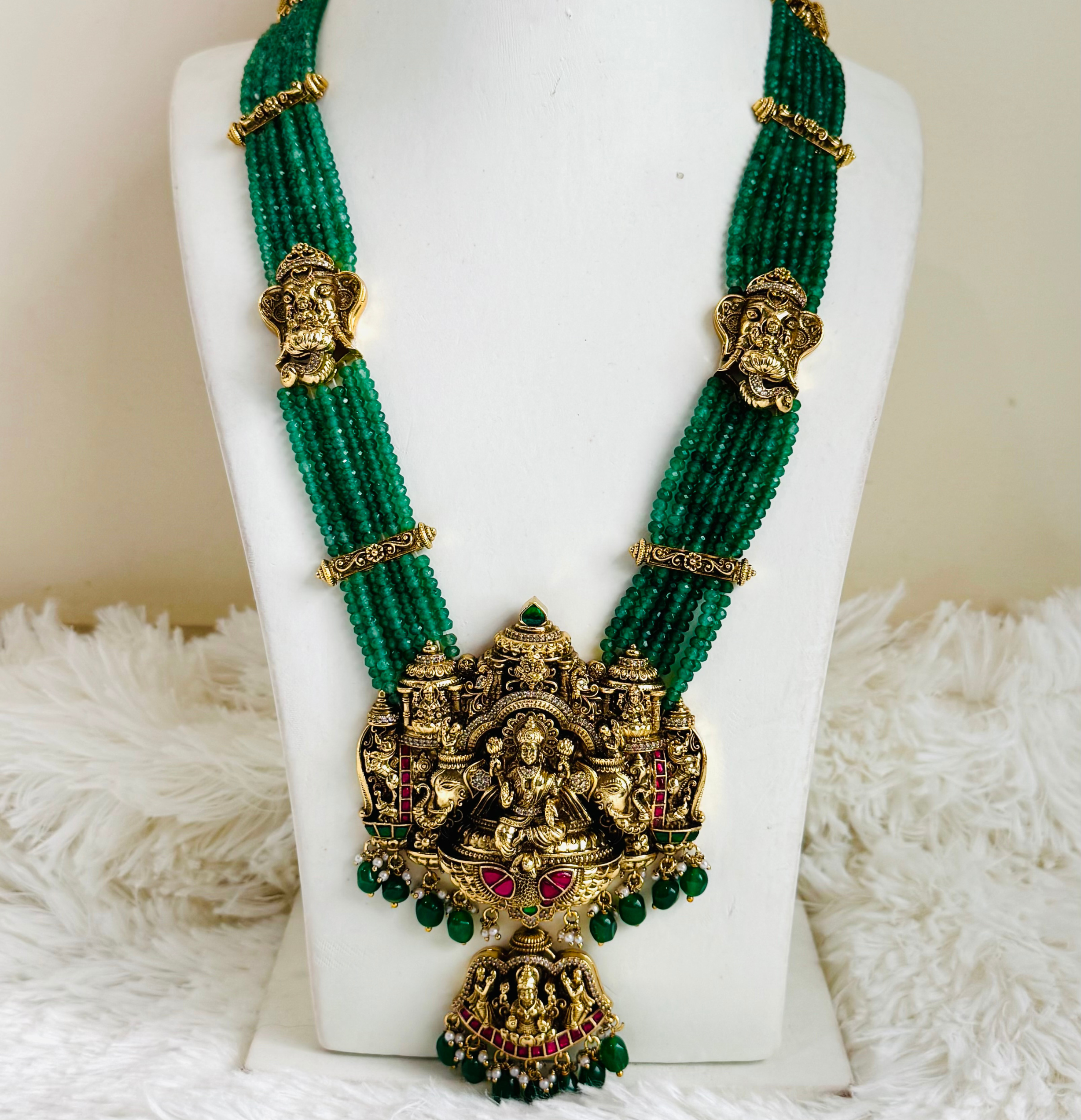 This Long Haram is made of gold-plated. Inspired by Maharani’s and it features Lakshmi motifs and a kemp stone, adding elegance and royal touch to your traditional look and this piece captures the richness of Indian tradition in every detail