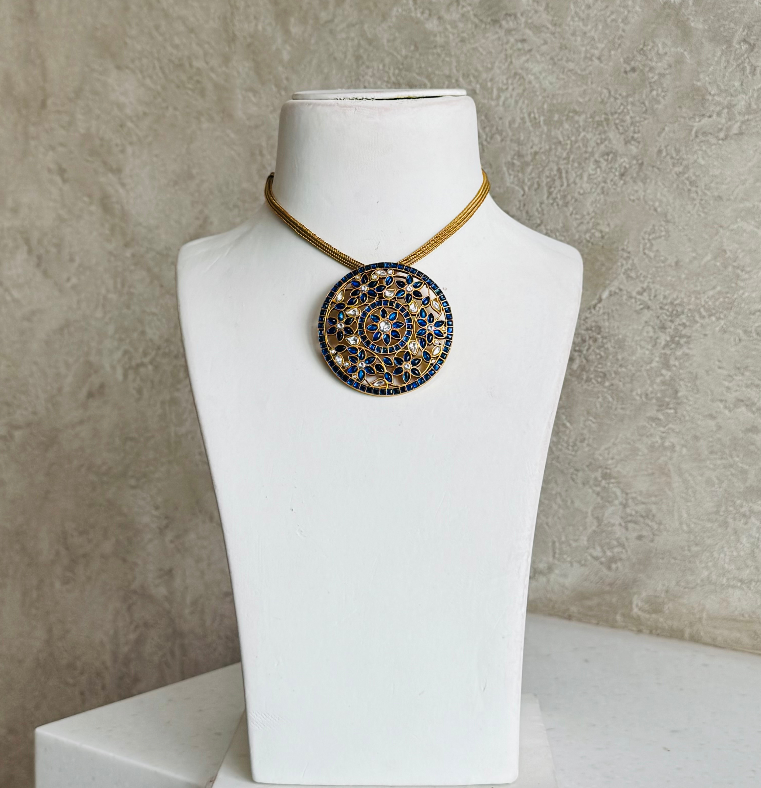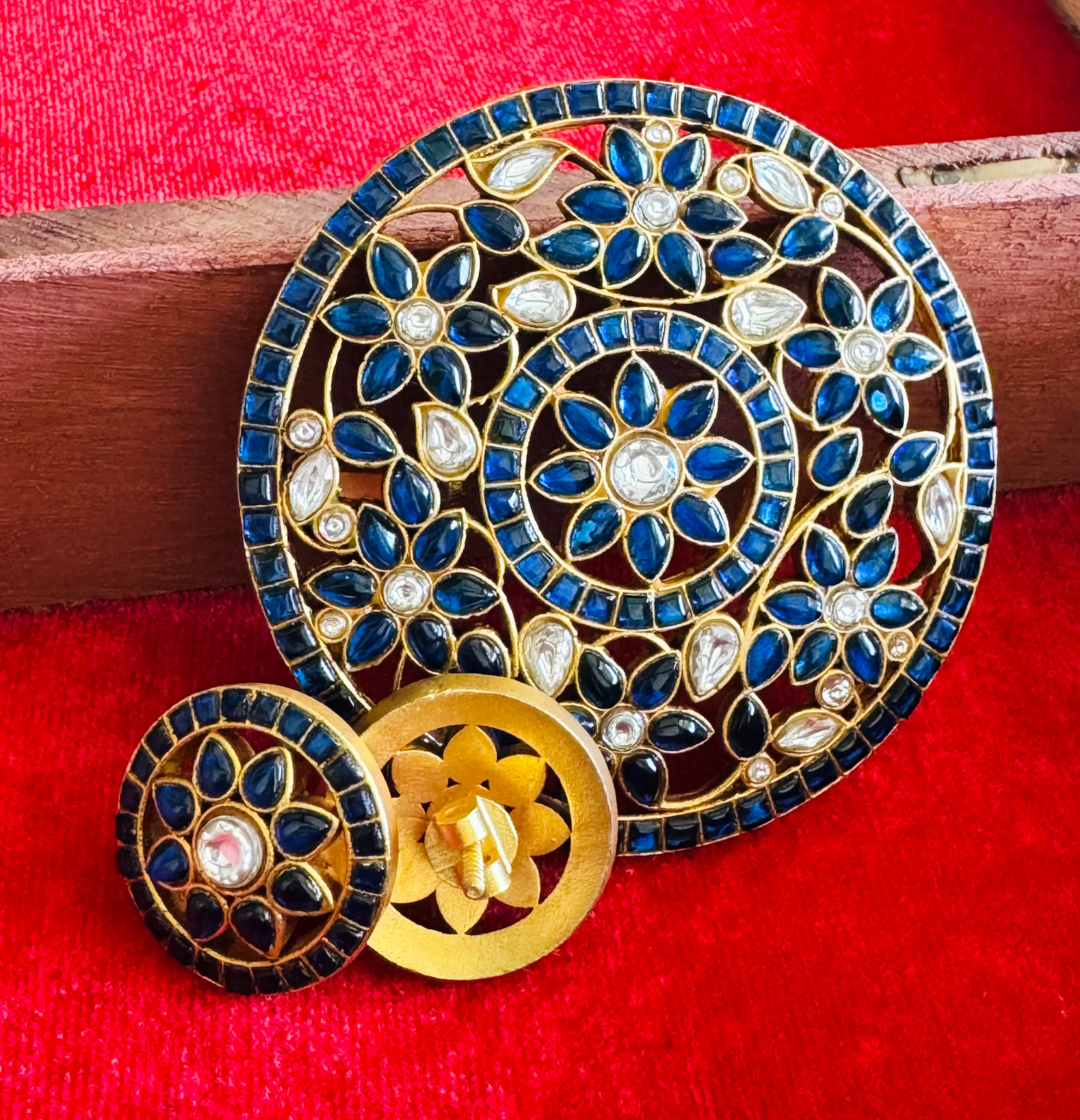 Beautifully handcrafted, this customised Jadau Kundan pendant showcases timeless elegance with intricate detailing. A hook at the back allows you to easily attach it to your chain, beads, or wear it as a striking centre piece on a pearl, beads or chain. A versatile and regal addition to your jewellery collection. (sample image shown with the chain – chain can be bought separately – price mentioned in only for the pendant and earrings)